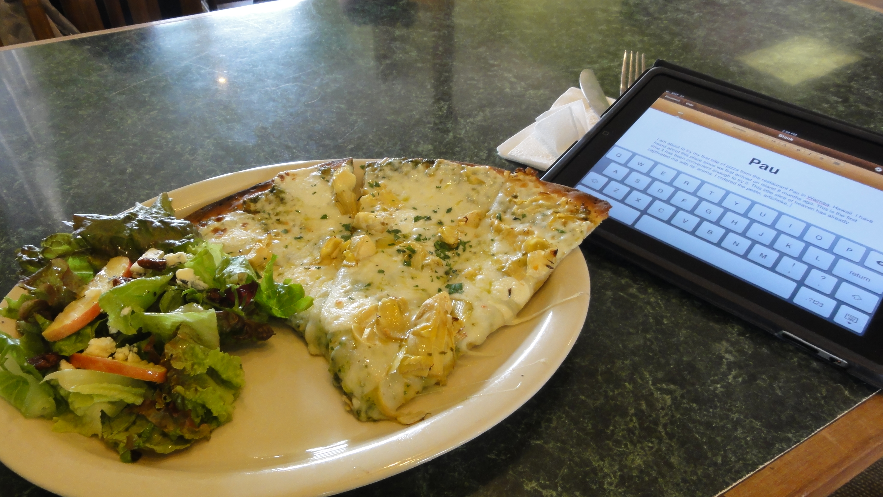 I am about to try my first bite of pizza from the restaurant Pau in Waimea, Hawaii. I ordered the pesto, artichoke, mozzarella. This little slice of heaven has already captivated me with its’ aroma. Enough of this blogging. I must get to the eating!!!