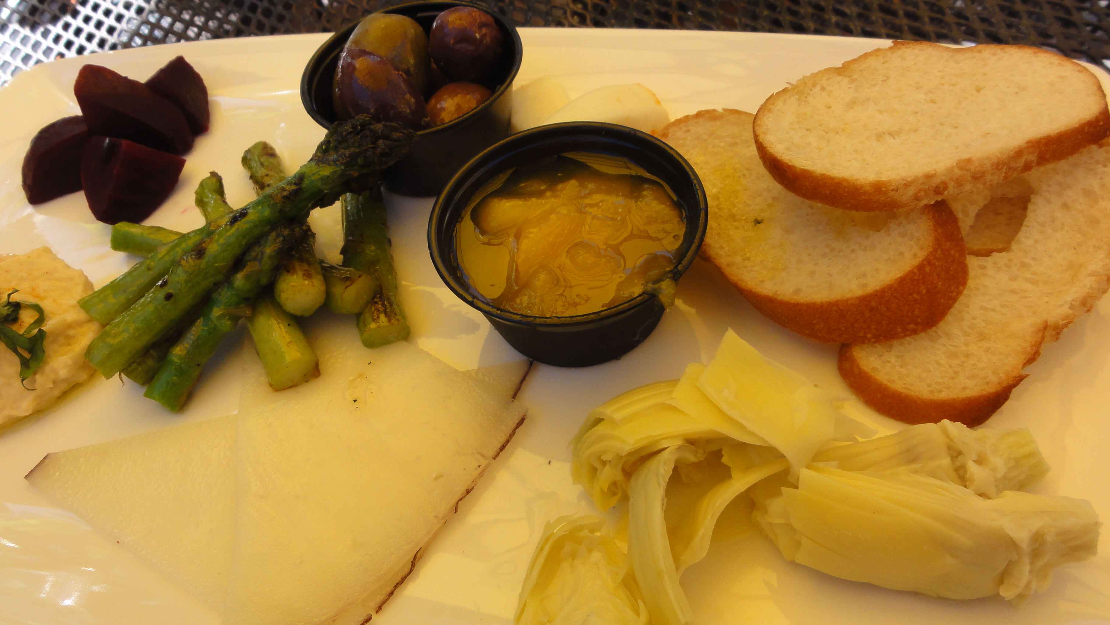 The Vegetarian Antipasto Plate consisted of handcrafted cheeses, artichoke hearts, local beets, olives, mango chutney, and more. I started with the fresh asparagus lightly sautéed to perfection. It was a little crisp with a little tart flavor retaining the character of the asparagus. One of the handcrafted cheeses was a Drunken Goat cheese, which has been described as ”goat milk with wine.” This semi-firm pasteurized goat cheese from Spain’s Mediterranean coast is cured for 48-72 hours in Doble Pasta red wine. It makes for a mild, sweet, and fruity flavor with a smooth, creamy, semi-firm texture. The next cheese was a port salute with a mild, savory flavor and a smooth, semisoft texture. Black and green kalamata olives are always a favorite. Next, there was hummus, lightly flavored with garlic, that leaves a light refreshing zing in your mouth and not enough to offend other flavors. The artichokes were steamed and still moist, soft, and flavorful. The locally grown beets were tasty, with a wonderful flavor. The mango chutney was more mango than chutney. It was sweet and contrasted the beets, asparagus, and hummus nicely. Served with baguette slices the individual players in the dish acted their part in a first-rate performance. The bread was a thinly sliced, lightly toasted, soft, melt-in-your-mouth french baguette.