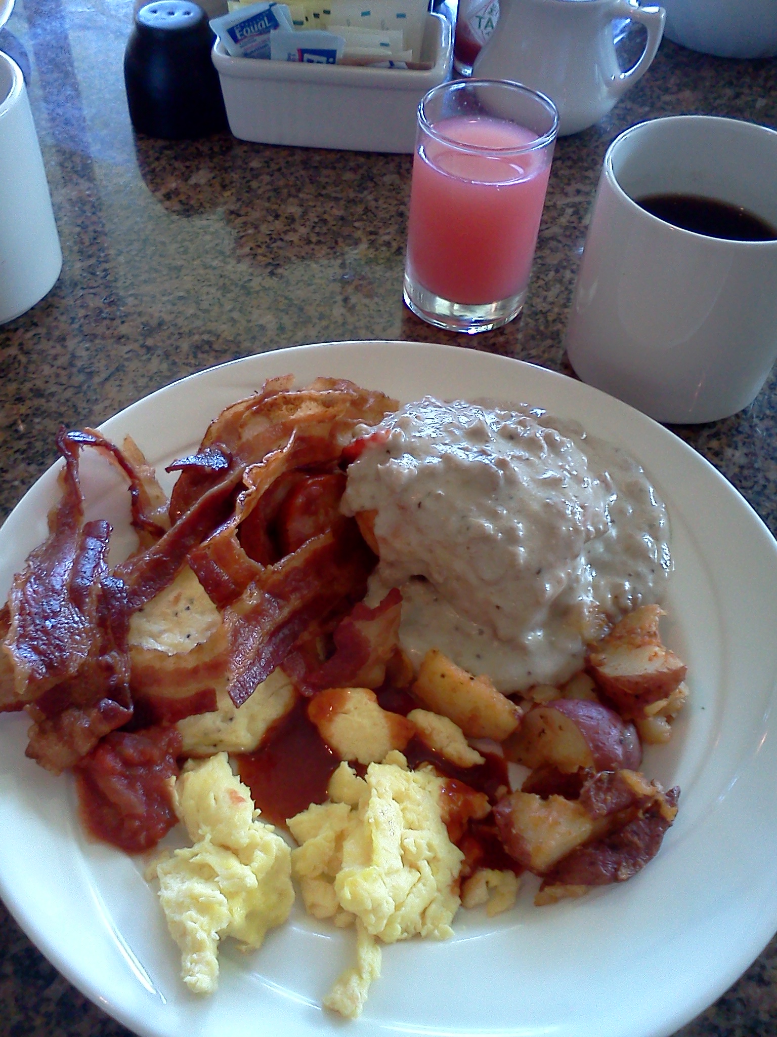 Biscuits and gravy delicious. I little spice. Good flavor. Biscuits could use a little more butter. Coffee is good. Not bad. Scrambled eggs looks and taste like they are out of a milk carton. The Korean bbq sauce is wonderful. Salsa sucks. From a bottle. Not home made. Quiche is pretty good once you add some sauce. Bacon is okay. Portuguese sausage is much better. Big, thick sausage slices full of flavor. The breakfast potatoes were okay.