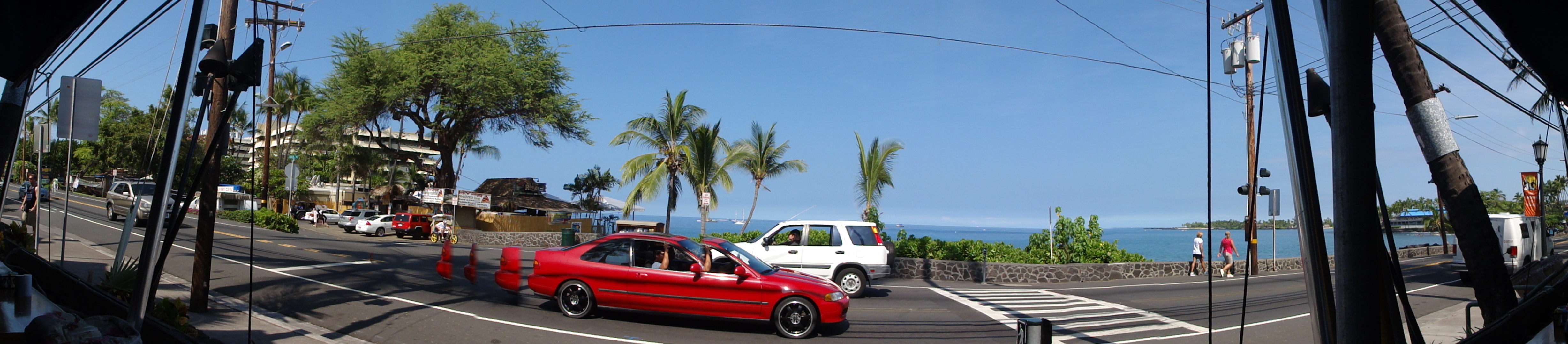 This morning we are enjoying the Ali’i Drive front row view from Bongo Ben’s Island Cafe in downtown Kona. I ordered coffee, Leise ordered a mango smoothie. Both are tasty but not great. The cynic inside me asks if the entire meal will be this unimpressive. Having said that, the menu has so many great choices: eggs Benedict; huevos rancheros; steak & eggs; catch of the day & eggs; loco moco; chorizo scrambled eggs; omelets with pulled pork; buttermilk or banana macadamia nut pancakes and more. It is difficult to decide what to order.