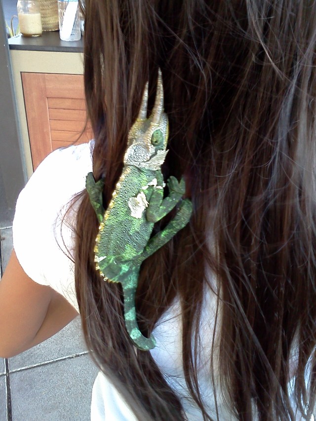 This last Saturday, two boys brought their two Jackson Chameleons to the Hawi farmer’s market and they are their new pets, since the day before! I think both Chameleons has names but I am not sure, one of them has name [which I know], Draco, which means dragon! My family and I saw the video you posted with my father! Hope everything is well with you and Auntie Leise!