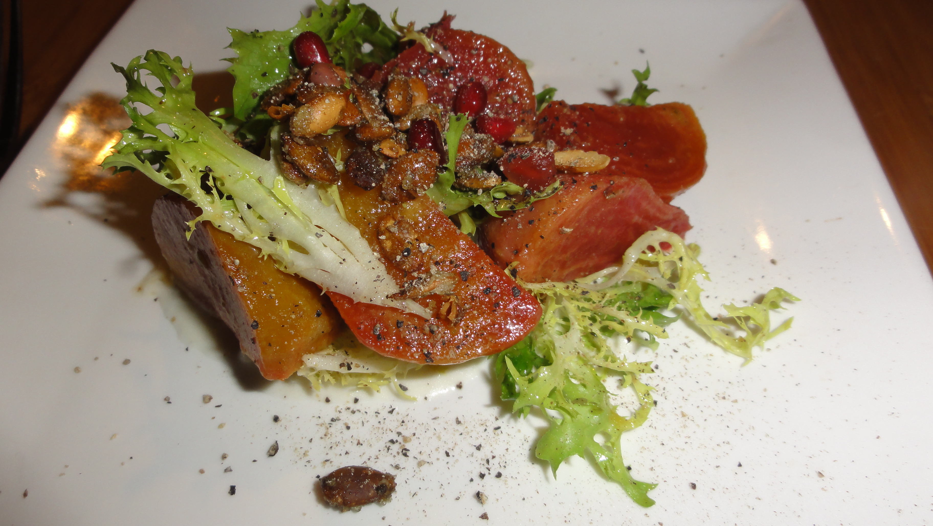 The restaurant has an beautiful feel to it except for the noise level, the hard surfaces make it quite noisy. When you are outside the restaurant and the door opens, you can hear the noise loudly outside. We start with pupus (appetizers) of Big Island Beet Salad with candied garlic vinaigrette dressing, sprinkled with local pomegranate and roasted pumpkin seed, all on a light bed of greens… It is wonderful. The diversity of flavors and the light complexities dance like starburst fairies in the back of my mind. On the side they bring a bowl of edamame which has a perfectly balanced Szechwan spice, light yet lingering. These are complimented by the fresh passion fruit juice to drink. This is a very nice start. They have set the tone and our expectations are high. I hope they don’t disappoint.