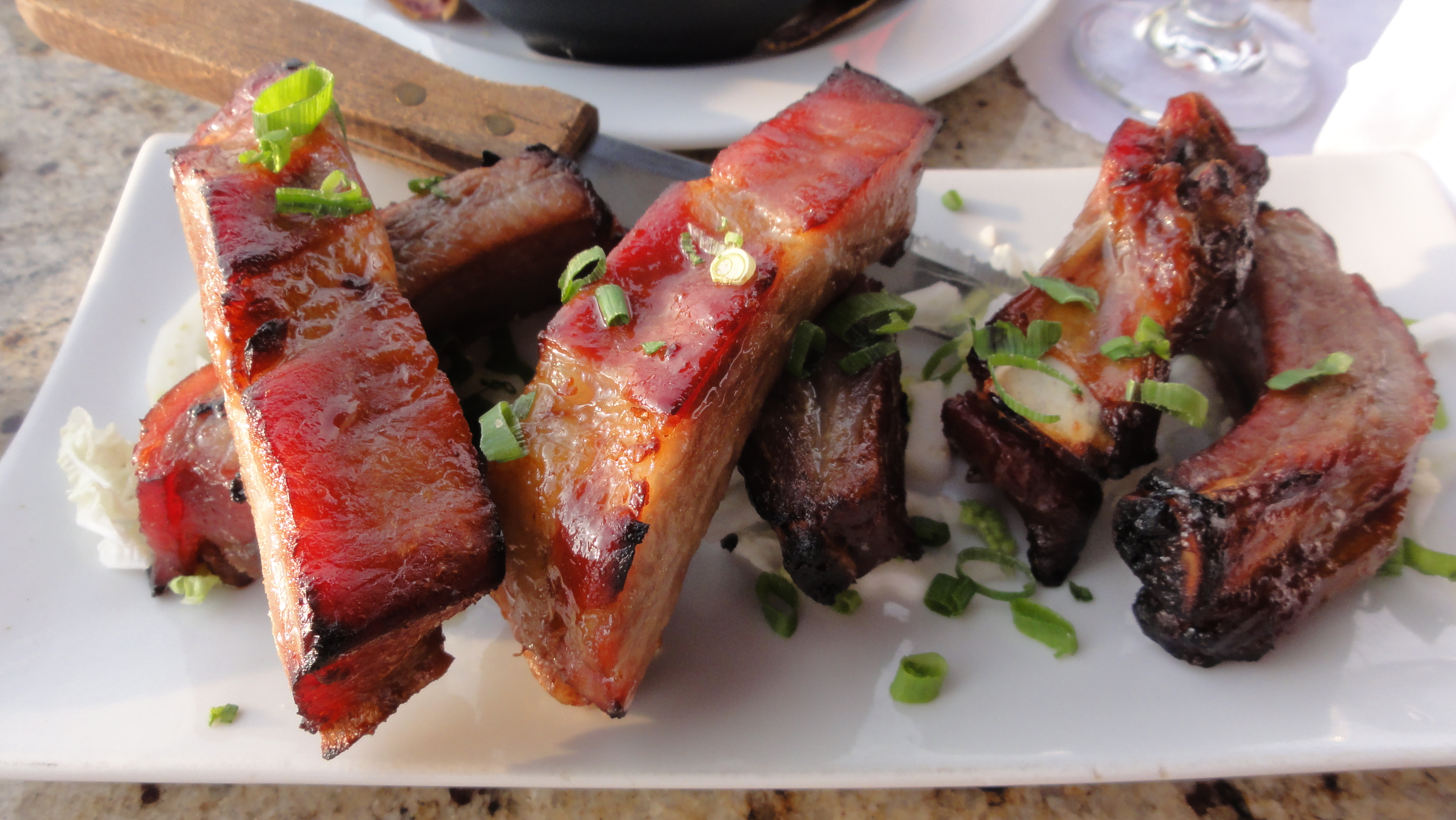 We decide to keep it lite tonight and stick with pupus (appetizers). We order the “famous” fried poke, the “famous” baby back ribs with coconut char siu glaze, fried calamari, and big island pineapple salsa and tortilla chips. I start with the chips… they look like taro chips and pineapple salsa. The first chips are tired and stale. The chips after that get a little crisper. The salsa is good. How do you hawaiianize anything?… Add pineapple. The poke is fantastic!! The calamari is a little soggy. The dipping sauce for the calamari is like a thousand island dressing which has been doctored up a little, but not enough to bring me back or have me order it again. The baby back ribs have good flavor and they come off the bone well, but they don’t fall off the bone and they are not very juicy. The Bloody Mary, the poke, and the view are the highlights of our evening. Leise also ordered a strawberry coconut frozen drink. It is wonderful.