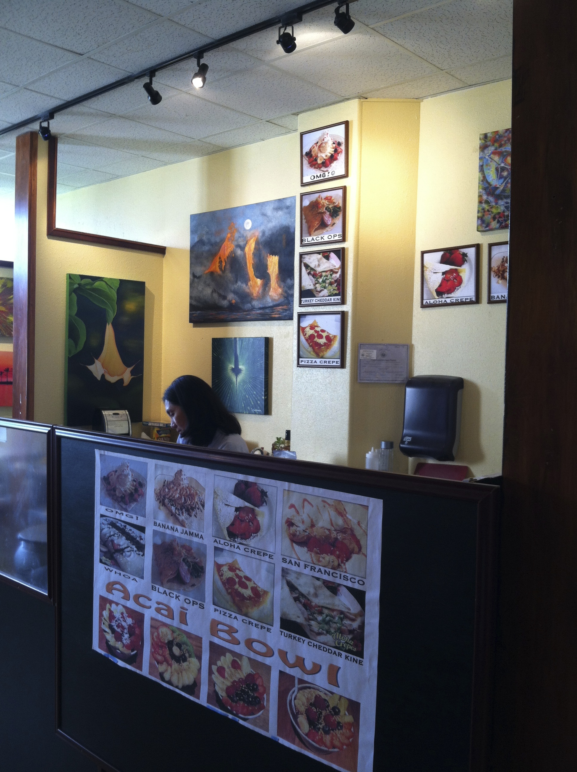 This little one woman operation is great. I feel the entrepreneurial spirit thriving here and I love it. The great food and good coffee we are enjoying this experience and will come back again. Don’t let the rating fool you. We will be back. For ambience I give Rumley Edible Art Cafe 4 out of 5 surfboards. It quite charming for a crepe shop. It’s small with very few seats but there are beautiful pieces of art work to look at and cool things to tantalize the visual senses. For food quality I give 4 out of 5 surfboards. For the warm friendly service I give 4 out of 5 surfboards. Overall I give it a 4 surfboards.