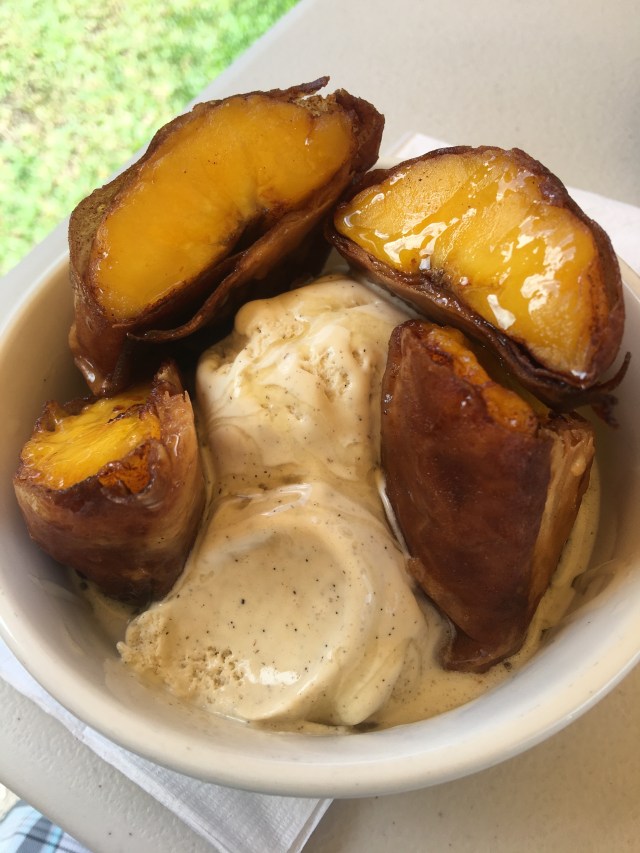 Eventually, I return myself to you and finish this blog. I order banana lumpia and two more cups of coffee. One for now with the lumpia and ice cream and one for the road. Banana lumpia is fried banana in an eggroll wrapper. In this case, served with cinnamon and “farm honey”. I chose the option of the local brand Tropical Dreams Tahitian Vanilla ice cream. It is a fantastic mix and is complimented wonderfully by the fresh brewed Ahualoa Farm coffee.