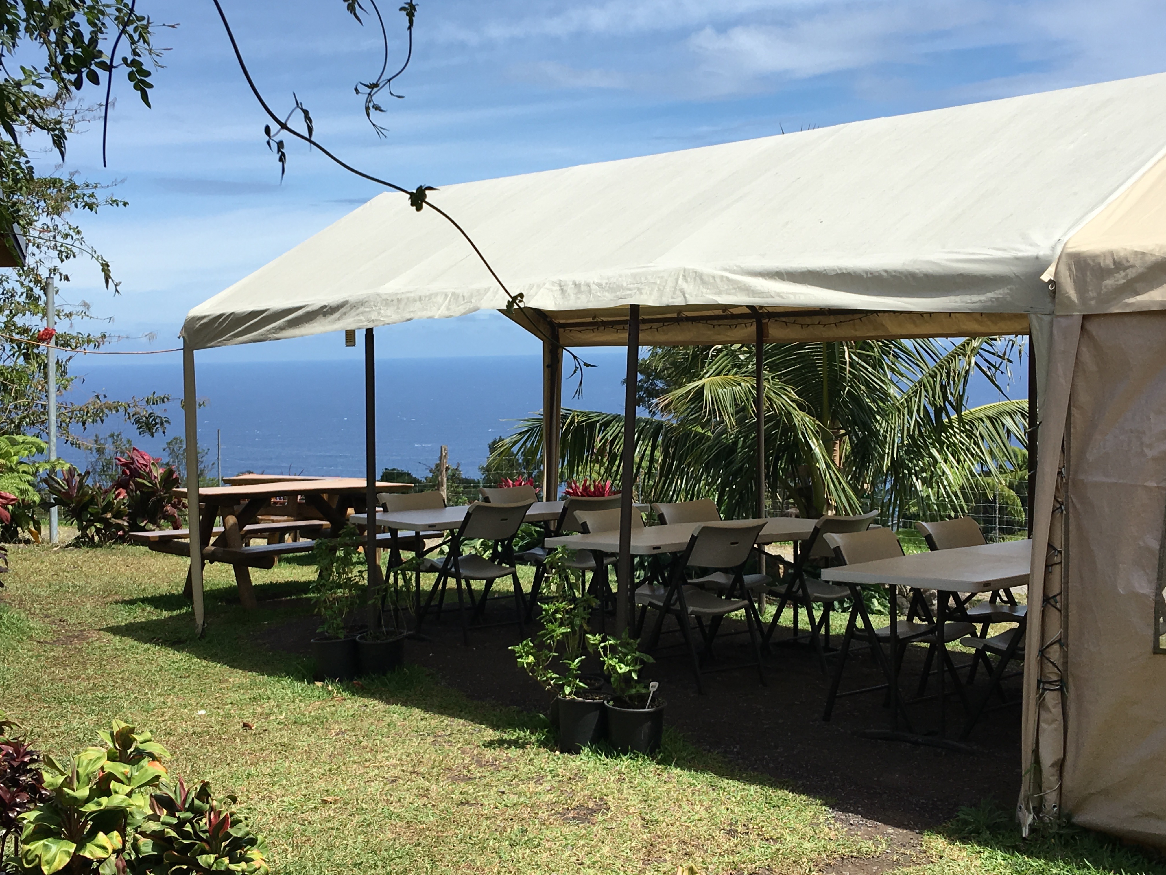 … This place, this space, this day is so perfect that I find myself still here 4+ hours later. I enjoyed the sun and a brief nap in the Adirondack chairs facing the ocean. Then, as happens in most parts of Hawai’i on the windward side, stick around long enough and you will feel the first few drops of rain. Putting on my shirt and finding shelter from the potential of rain and wanting to protect my iPad I reposition myself at the tables under the long tent. I was not ready to leave yet. So I order another cup of coffee and dive deeper into my mobile devices. Luckily the cafe has wifi. There is no cellular service out here. I love that feeling of being disconnected from the world.