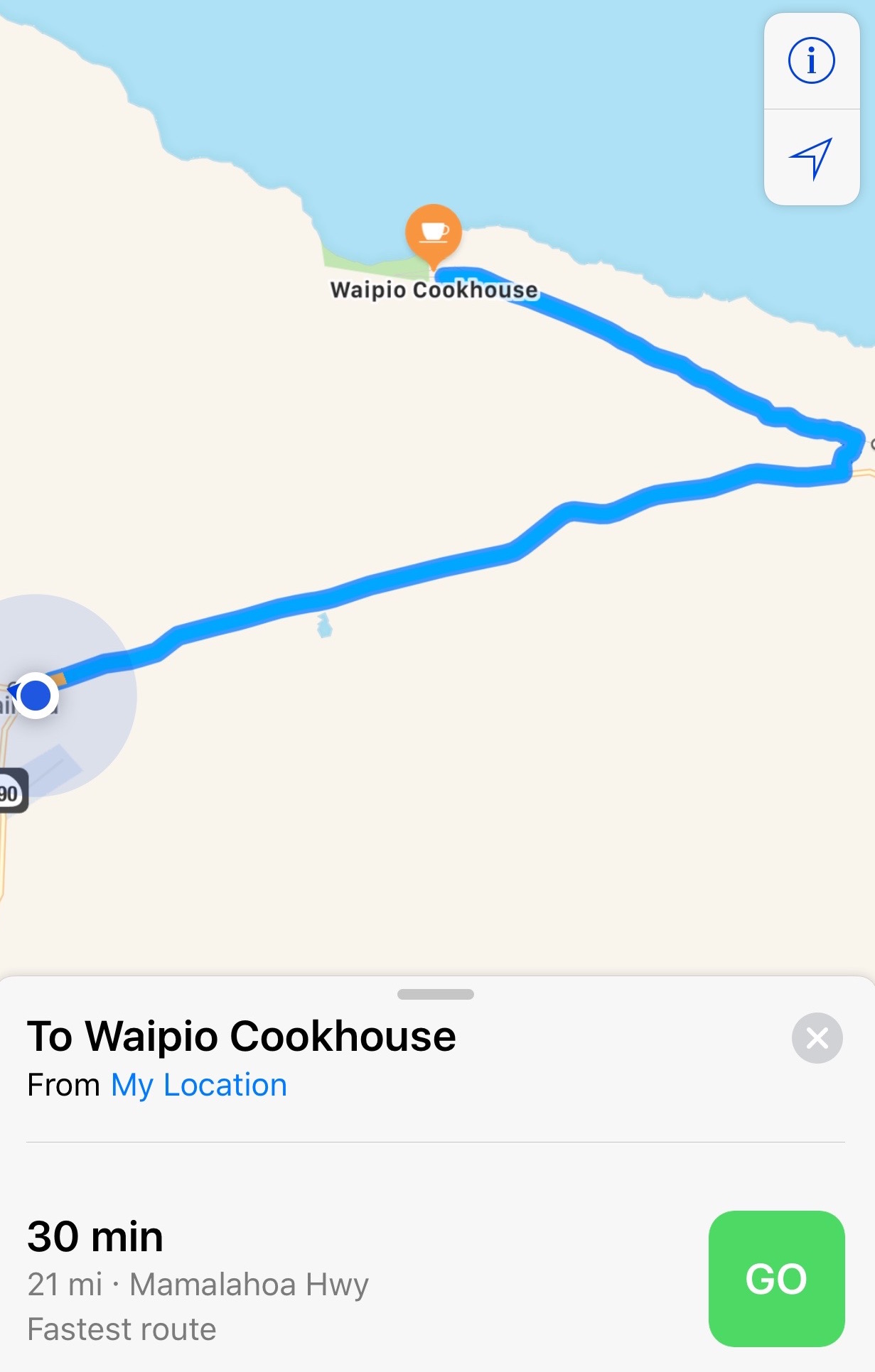 The loco moco is fantastic. The white rice is steamed and fluffy. They’ve added sweet onions which are a nice addition. The gravy is more of a white gravy versus a brown gravy. The pig is full of flavor and very tasty. Not too salty. That is often a problem in some restaurants. My attention suddenly shifts to a white egret which slowly flew in and landed in the tree in front of me as I relax looking out passed it to the ocean as the light cool trade winds of the Hamakua Coast come gently off the ocean and caress my face.