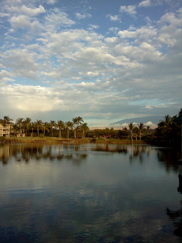I am often asked why I moved to Hawaii. My response has usually been, “Because of everything which is Hawaii.” As I sit here I look across the golf course, through the palm trees, up the hill towards Waimea. The hills along the Kohala Coast are covered in fluffy, puffy clouds. I am awed by the richness of the colors. Since Hawaii is the most remote place on the face of the planet there is virtually no pollution. Thus the skies are crystal clear blue, the clouds are pristine white, and all the colors of the green grass, palm trees, bushes, multiple shades of azure water which makes Hawaii the most beautiful place I have ever seen.