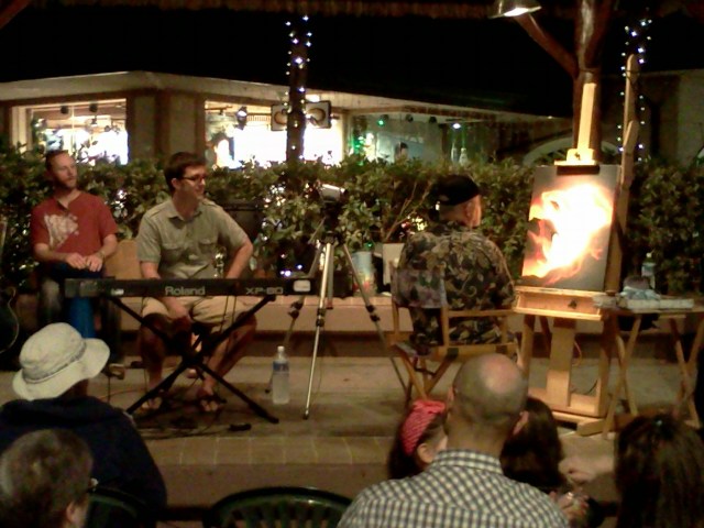 Michael is playing keyboard with friends on bongo, flute, and guitar setting the mood while his dad, Robert Thomas, paints. King’s Shops, Waikoloa Beach, Hawaii